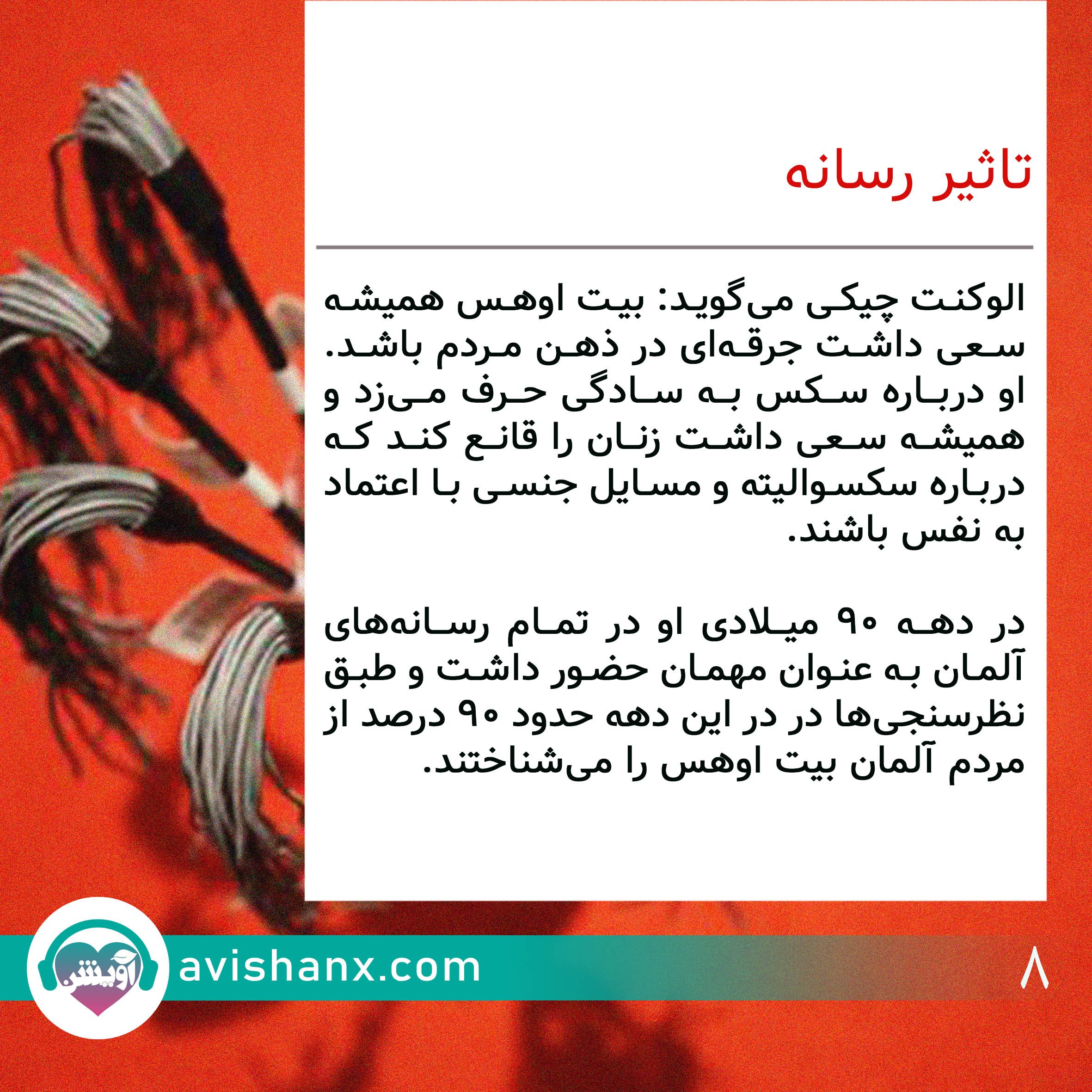بیت اوهس حدود ۱۰۰ سال پیش متولد شد زمانی که جامعه آلمان درگیر جنگ و ویرانیهای پس از آن بود و او با پایهگذاری شرکتی برای بهداشت زناشویی سنگ بنای فروشگاههای زنجیرهای وسایل جنسی خود را گذاشت و سعی کرد نگاه جامعه به رابطه جنسی را تغییر دهد و تابوهای اجتماعی را به چالش بکشد.
